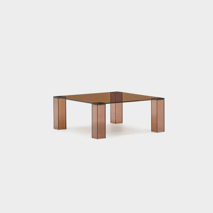 The very stunning Adularia side table is a minimalist design of beautiful tempered glass with seamless lines and angles. With the signature aesthetic of 70's mediterranean design, the gorgeous amber brown colour is enhanced by light and elevates a feeling of spaciousness. Precision detailing is perfectly balanced by the ultimate simplicity of its form. Combine with the coffee table for a layered floating effect of differing shapes  and heights. The geometric elegance of the Andularia side table intensified by its stunning colour, adds a contemporary and unique design touch to any environment.