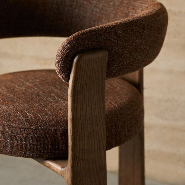 The striking Granite dining chair is timeless elegance, designed with beautiful moulded and sleek shapes, inspired by the Scandinavian character of the 70s. Defined by its unique 3 leg profile, creating a supremely contemporary footprint. The slimline frame is crafted from solid timber with a beautiful dark walnut stain, upholstered in a gorgeous two-tone chenille fabric with recycled components, in stunning Coffee Brown . Generous proportions create an extra comfortable seating position with the perfect amount of firmness. An exclusive chair with meticulous attention to detail to bring personality & relaxed International style to your space.